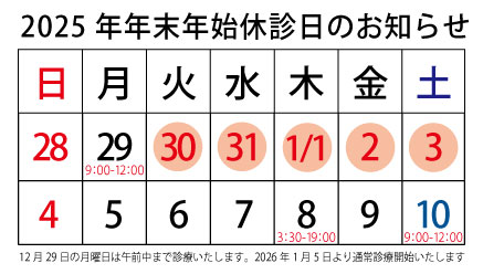 - NEW12月29日の月曜日は午前中まで診療いたします。2026年1月5日より通常診療開始いたします。よろしくお願いいたします。